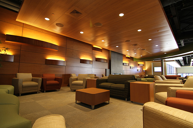 This 40,000 sq. ft. renovation included a Commons Area, Bookstore, Post Office, Coffee Bar "Common Grounds" and Palms Grille. Work included installing a 40 foot tall structural steel atrium above an existing two story structural steel roof & deck, while maintaining occupancy of the college bookstore, post office & grille and protecting students from construction renovations and existing utilities and providing a water-tight building envelope over the entire structure during renovations and installing a new elevated atrium. Other finishes include Terrazzo floors, ceramic tile floors, custom wood walls, circular architectural ceilings, custom wood panel ceilings, millwork finishes and a grand stair case with stainless steel and glass handrails and a south stair tower complete with glass, glazing and stainless steel handrails. The exterior finishes included brick masonry and EIFS to match the existing college color scheme. |